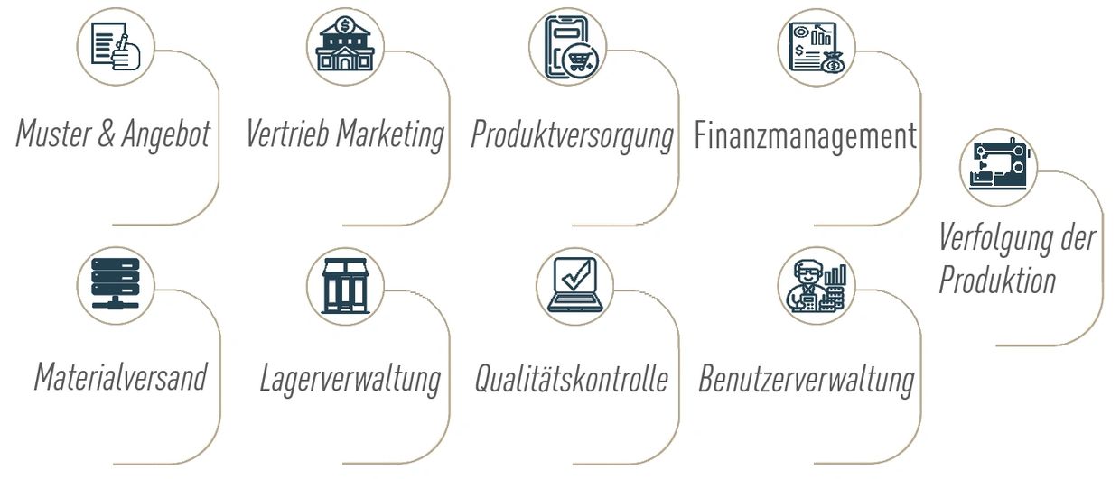Unsere Textil-ERP-Software ist eine Boutique-ERP-Software, mit der Unternehmen, die in der cloudbasierten Textilproduktion tätig sind, alle End-to-End-Prozesse verfolgen können.
